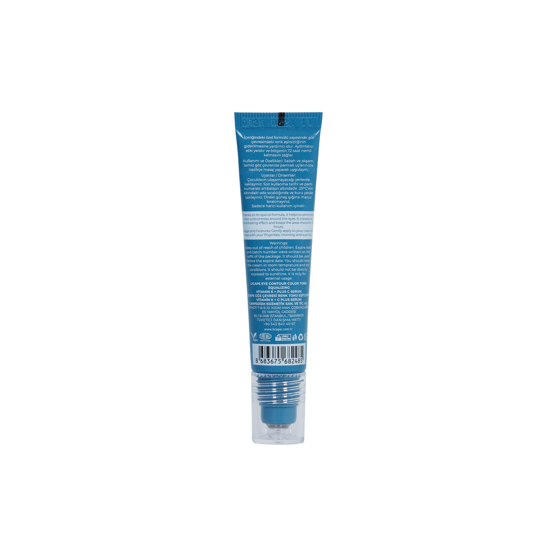 Licape Eye Contour Vitamin K + C Serum, özel geliştirilmiş formülüyle göz çevresinde renk tonu eşitsizliğini azaltmaya, koyu halkaların görünümünü hafifletmeye ve cilde canlı bir ışıltı kazandırmaya yardımcı olur. Vitamin K ve C’nin güçlü aydınlatıcı etkisi, Squalane ve Glutathione ile birleşerek göz çevresine bakım yaparken uzun süreli nem desteği sağlar.